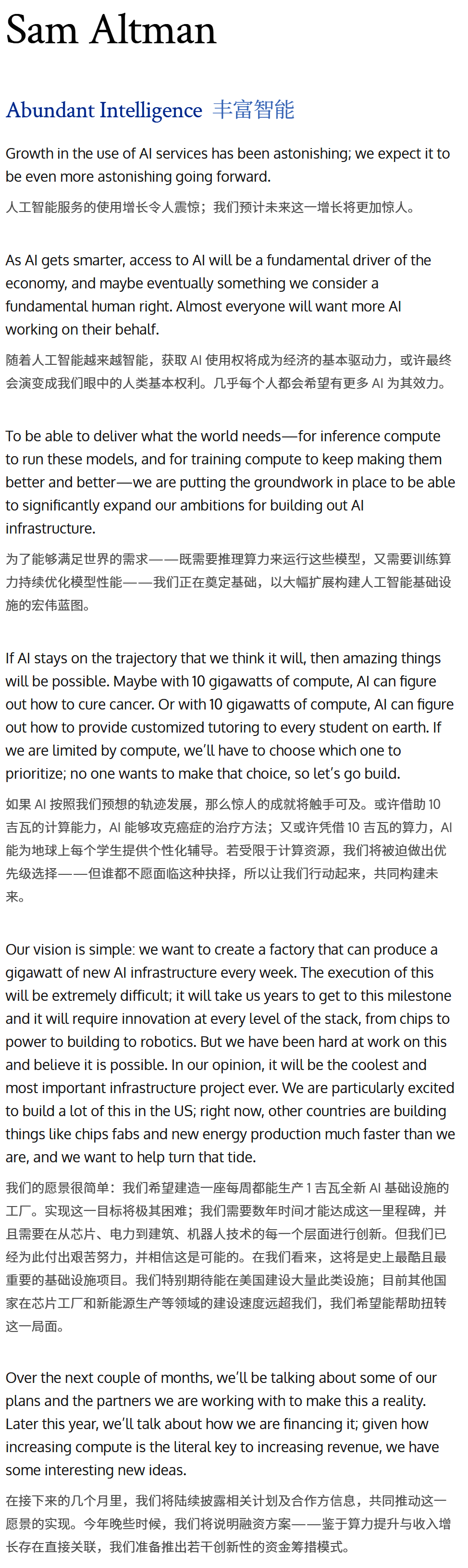 同在今天,奥特曼更新一篇博文——智能富足的时代,进一步阐明了大规模超算建设,将会释放AI的全部潜力。