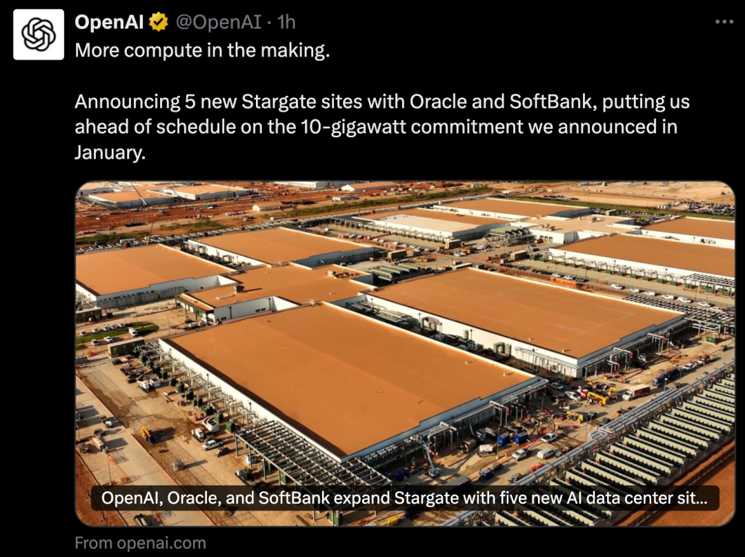 【新智元导读】继英伟达千亿投资OpenAI之后,「星际之门」立即官宣新增五个站点,预计年底前达成10GW目标。发文称,目标打造一个每周GW级「AI工厂」,AI无限算力或将治愈。