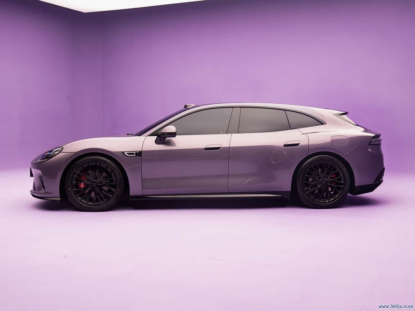 再来看车身侧面部分,侧面采用凌厉双腰线设计,从前翼子板贯穿至车尾,增强车身立体感与修长感,车顶线条从A柱顺滑下滑至车尾,形成大溜背造型,风阻系数极低,兼顾美学与续航效率。新车标配无框车门+隐藏式电动门把手,开门瞬间格调拉满,同时降低风阻;搭载21英寸多辐式运动轮毂,样式精致动感,搭配高性能静音轮胎,兼顾操控与静谧性。车身采用钢铝混合材质,轻量化与刚性兼备,蚌式铝合金前舱盖做工精湛,侧面轮廓修长优雅,每一处细节都彰显高端定位。